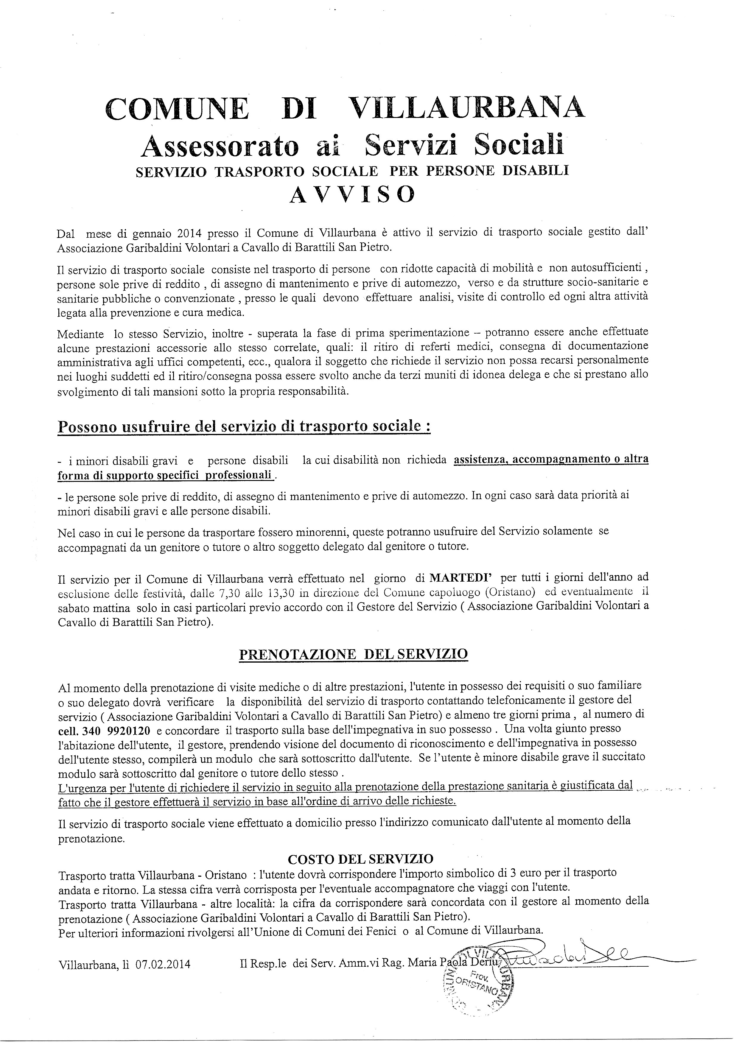 E' stato attivato il servizio di trasporto sociale per persone disabili e persone sole prive di reddito e automezzo. Per maggiori informazioni consultare l'allegato avviso.
