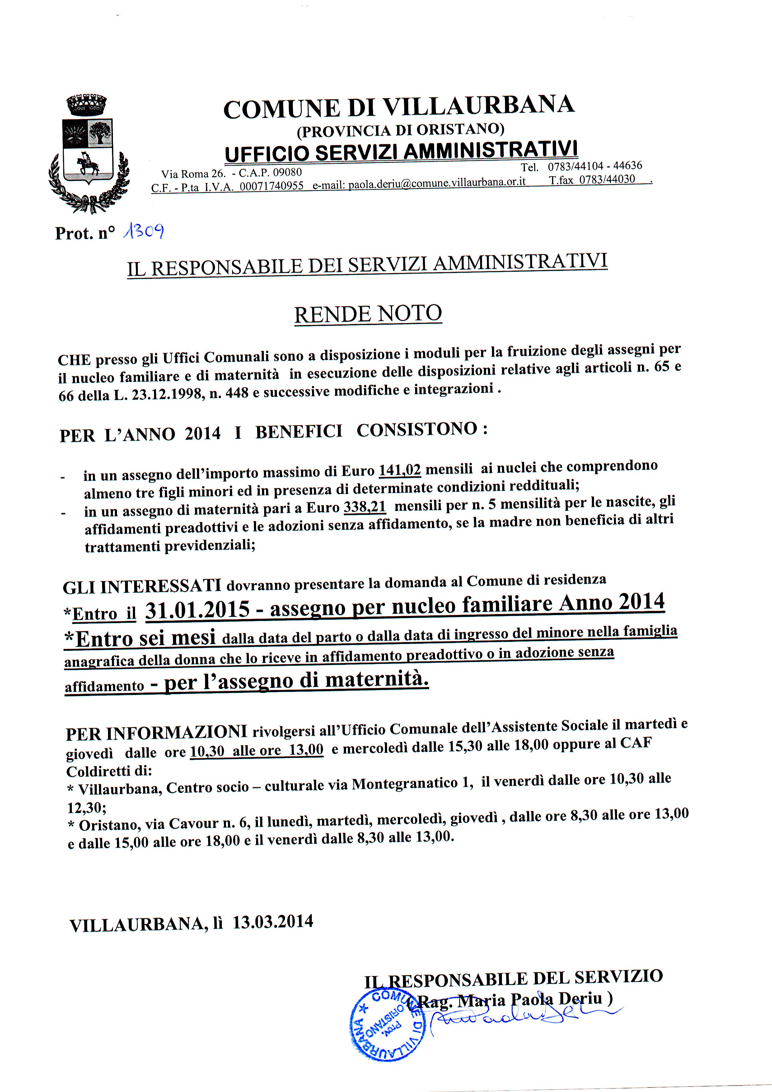 Si informa che sono disponibili i moduli per la fruizione degli assegni per il nucleo familiare e di maternità. Per ulteriori informazioni, consultare l'avviso allegato.