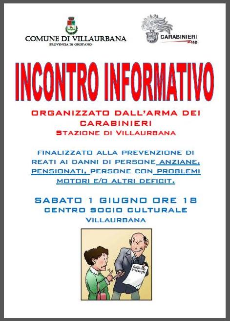 Il Comando dei Carabinieri - Stazione di Villaurbana, organizza per Sabato 1 Giugno alle ore 18, presso il centro socio culturale, un incontro informativo finalizzato alla prevenzione di reati (truffe, rapine) ai danni di persone anziane, pensionati, persone con problemi motori e altri deficit.