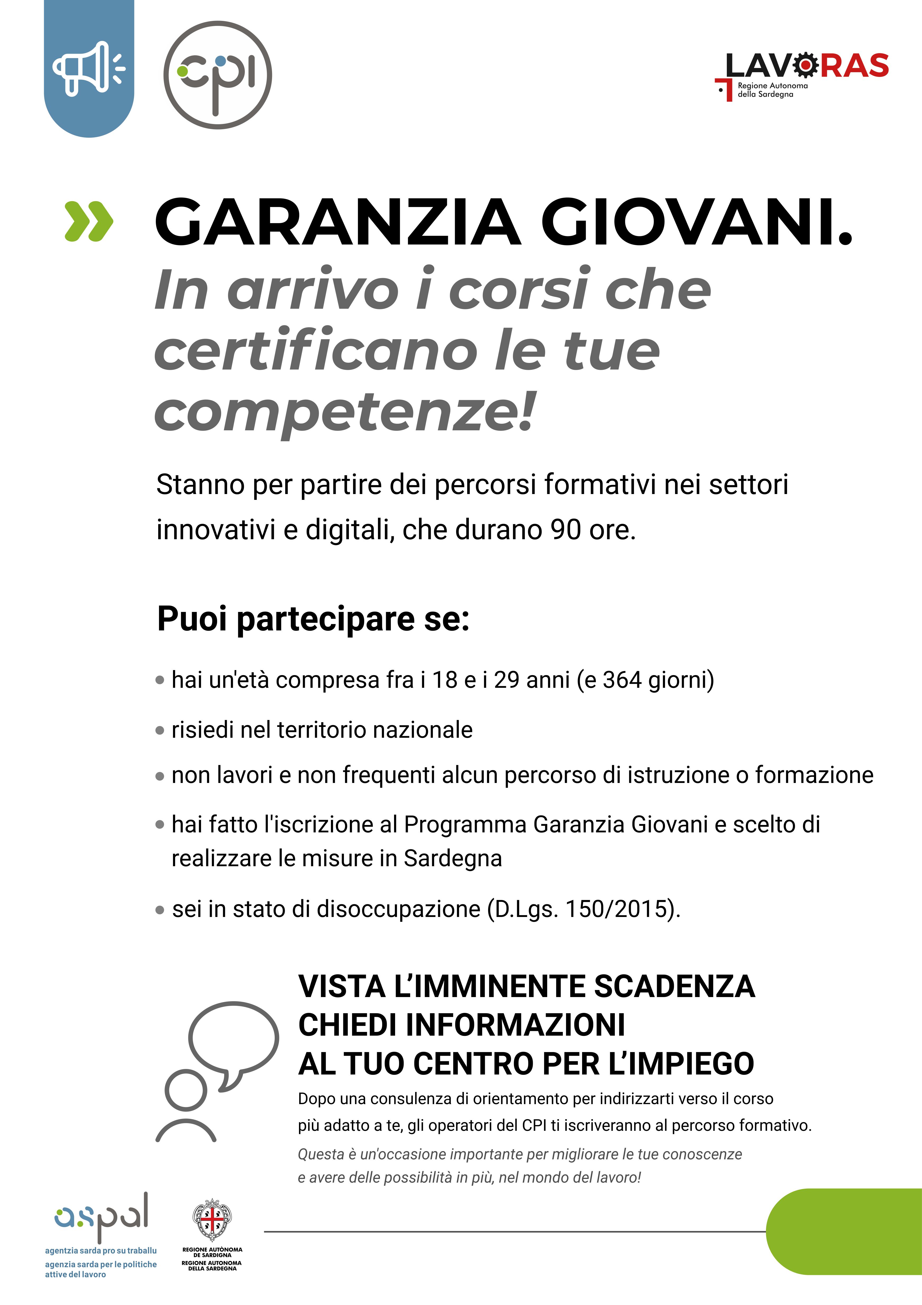 Percorsi formativi rivolti ai giovani NEET di età compresa tra i 18 e i 29 anni (30 anni non compiuti), che non hanno un lavoro e non sono impegnati in percorsi di istruzione e/o formazione. Corsi che verranno avviati entro il mese di luglio. Maggiori dettagli nella comunicazione Aspal.